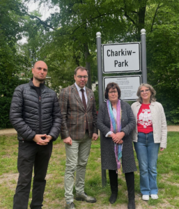 Am 24. Oktober 2022 wurde der bisher namenlose Park hinter der Schwartzschen Villa unter großer Anteilnahme von Bürger*innen, Ukrainer*innen und Mitgliedern aus Politik und Verwaltung feierlich als Charkiw-Park eingeweiht. In ihrer Ansprache würdigte Bezirksbürgermeisterin Maren Schellenberg die enge Verbundenheit mit unserer Partnerstadt Charkiw, die bis in die nahe Vergangenheit aus regelmäßigen gegenseitigen Besuchen bestand. Mit dieser Namensnennung drücken wir die Solidarität und Verbundenheit mit den Menschen in Charkiw aus.