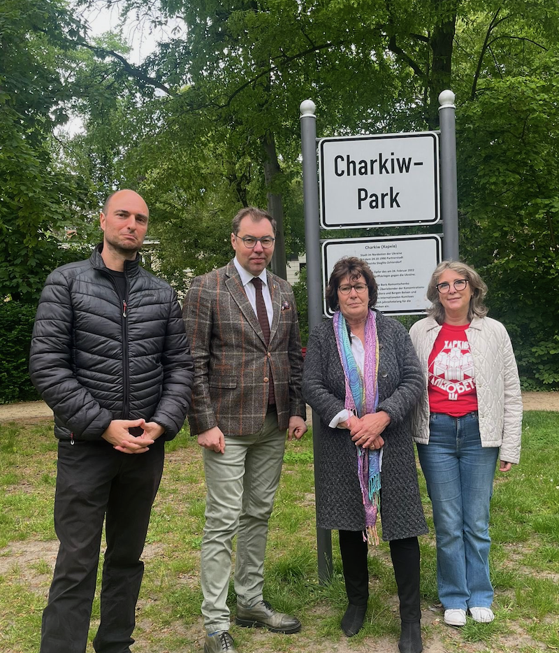 Am 24. Oktober 2022 wurde der bisher namenlose Park hinter der Schwartzschen Villa unter großer Anteilnahme von Bürger*innen, Ukrainer*innen und Mitgliedern aus Politik und Verwaltung feierlich als Charkiw-Park eingeweiht. In ihrer Ansprache würdigte Bezirksbürgermeisterin Maren Schellenberg die enge Verbundenheit mit unserer Partnerstadt Charkiw, die bis in die nahe Vergangenheit aus regelmäßigen gegenseitigen Besuchen bestand. Mit dieser Namensnennung drücken wir die Solidarität und Verbundenheit mit den Menschen in Charkiw aus.